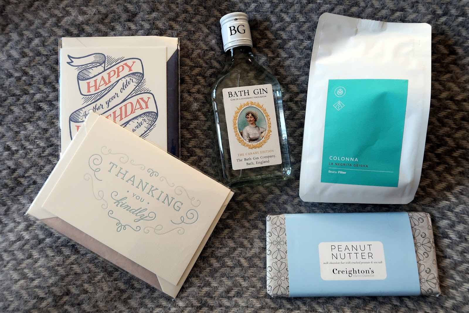 My haul included coffee from Colonna & Small’s, gin from the Bath Gin Company, cards from Meticulous Ink, and some chocolate, lip balm (not pictured) and a mini Baggu (not pictured) from Found.