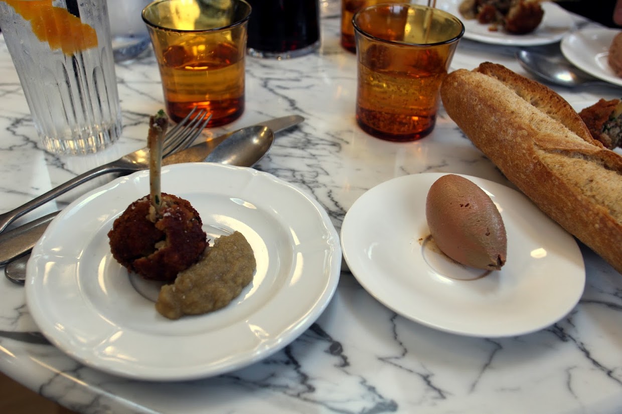 Then the food began to arrive. Courses one and two were, thankfully, small: chicken liver pâté, served with freshly baked bread, and a chicken croquette with onion jam. I’ve never liked pâté, but I figured that this was the perfect time to try it. Although I could have done with some more bread — we shared one small baguette between the three of us — it was creamy, rich and delicious. The croquette — bone-in — was also very tasty.