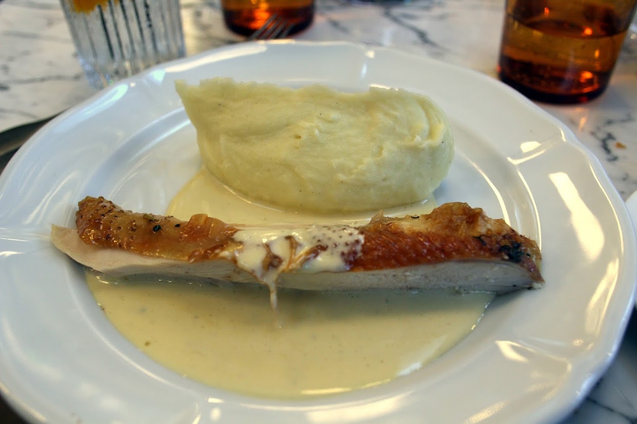 Next up was the chicken breast served with the creamiest, most gorgeous mashed potato I’ve ever had (it usually comes with morel mushrooms, but they catered to my mushroom misgivings and served mine sans morille), followed by chicken thighs with a green salad. I thought the breast and thighs were both excellent, although my brother was a little less impressed with the thighs, which weren’t quite so juicy and tender.