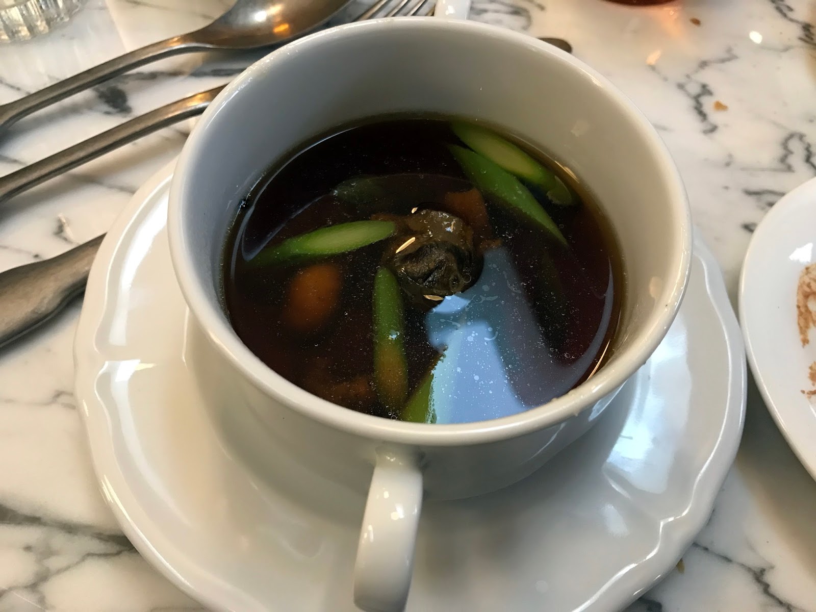 The next course was more challenging for me, my decade of vegetarianism coming back to haunt me. A consommé with asparagus came served with a skewer of offal: the comb, gizzard, heart and sweetbreads. The comb wasn’t really my thing, but the others were incredibly flavoursome, even if I did have to work up the courage to try them.