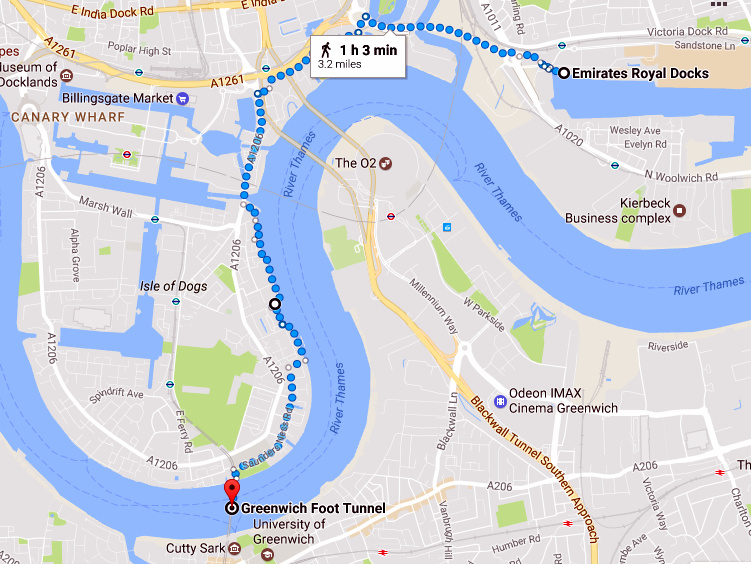 It took about an hour to walk down to the tunnel, including plenty of time to take photos of Canary Wharf (there’s a particularly striking view from Blackwall Basin), The O2 and North Greenwich. By the entrance to the tunnel, there is an excellent view across the river in Greenwich of the Old Royal Naval College, whose staid, symmetrical architecture contrasts starkly with the buildings of the Isle of Dogs. I have run through the Greenwich Foot Tunnel a few times but it’s still a novelty for me and before long, I was emerging into the sunshine next to the Cutty Sark.