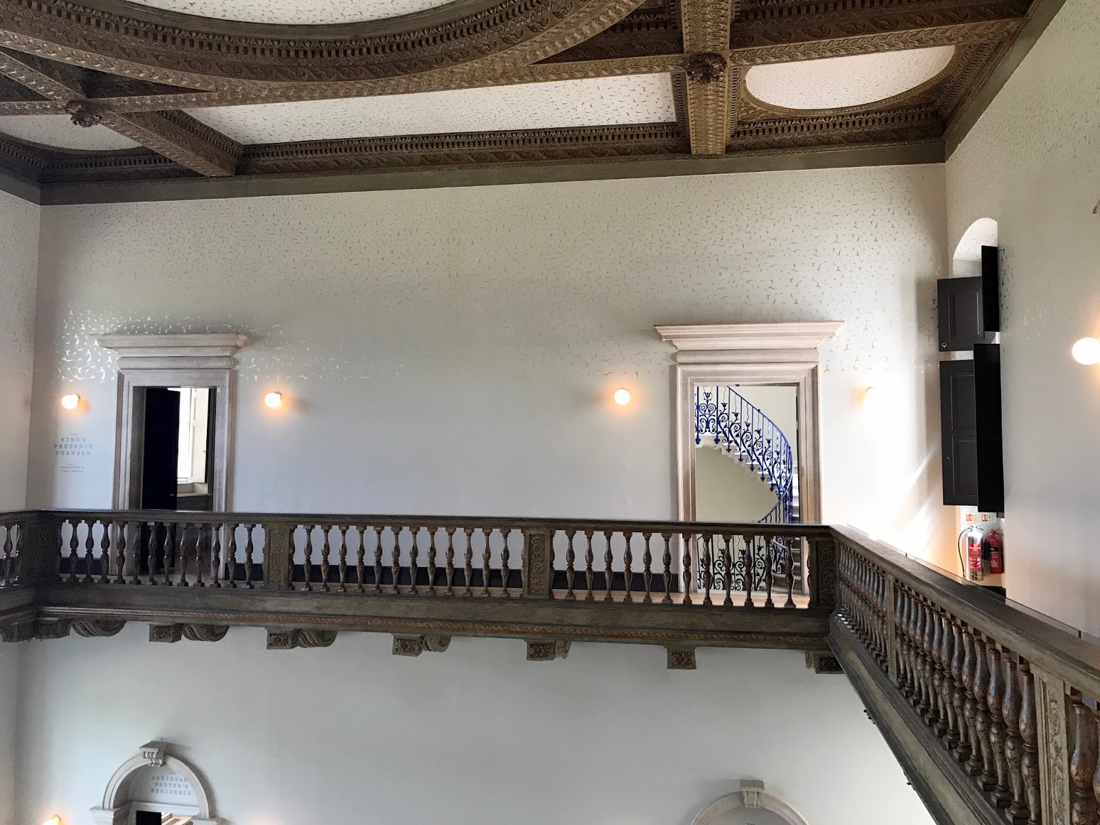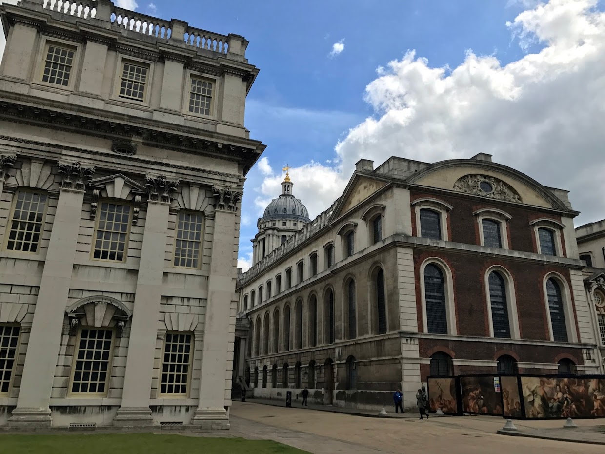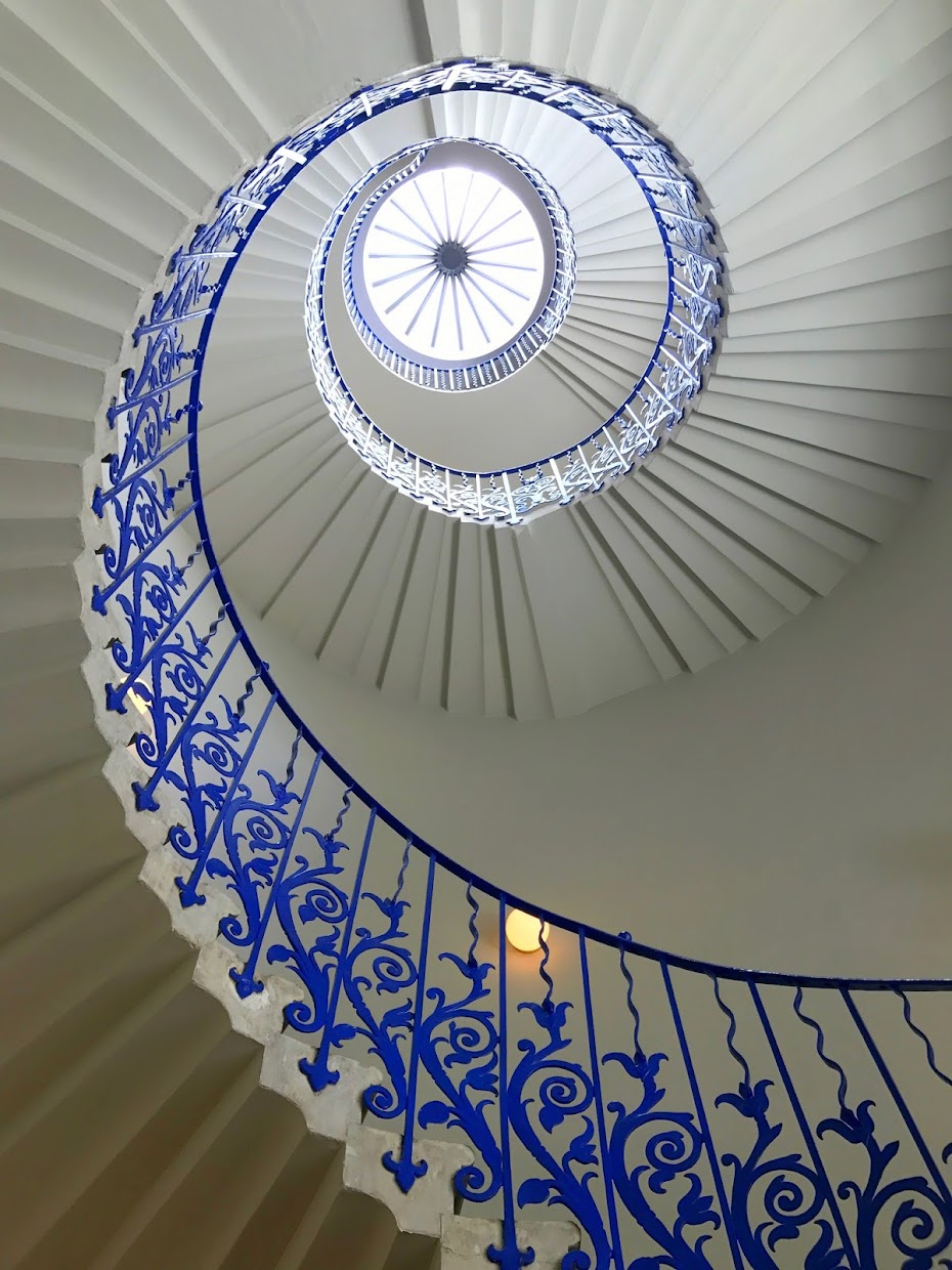I walked through the Old Royal Naval College (home to the Painted Hall, among other things), which I’ve visited a few times before and then crossed over into Greenwich Park where the Queen’s House is located (entrance is free, although donations are very welcome). Inigo Jones created the residence for Anne of Denmark, wife of James I, in the 17th century and the whole building is exquisitely designed. Perhaps the jewel in the Queen’s House’s crown is the feat of geometry that is the Tulip Stairs, a beautiful, Venetian-inspired cobalt-blue spiral staircase that was England’s first self-supporting spiral staircase.