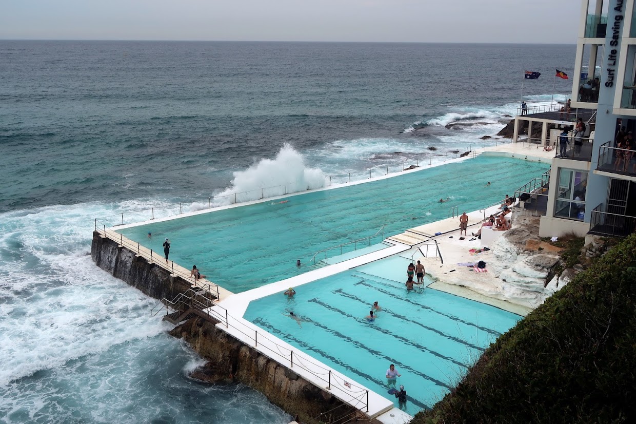 I’d planned to go to Bondi Beach on a weekday when I thought it might be quieter but neither Thursday nor Friday had suitable beach weather, so I caught the bus over on Saturday afternoon (both the 333 and the 380 take about 35 minutes from the CBD). Although it wasn’t hot by Sydney standards, it was warm enough to sunbathe and take a dip. The waves were pretty huge, though, so it was better suited to body-surfing and wave-jumping than swimming. The Qantas cock-up that left me with an extra day in Sydney on Monday, happened to occur on an extremely hot day — the mercury hit 36C in the afternoon — and so I headed back to Bondi to try to cool off. The sea was a bit calmer and I also visited the Bondi Icebergs Ocean Pool to do some proper swimming.