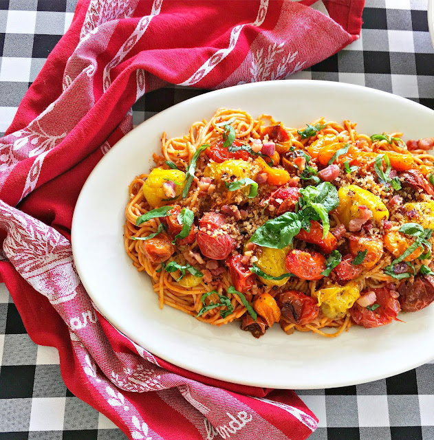 Mid-August is heat lightning and crickets, blazing sunsets, county fairs and tent revivals, iced tea in tall frosty glasses. The long, humid days cry out for a simple meal. No side dishes or dessert, just a huge bowl of angel hair pasta. Scented with basil and tossed lightly in Bandy's tomato sauce, this dish is packed with flavor: roasted heirloom tomatoes, pancetta, a dusting of Parmesan and garlic-shallot breadcrumbs. Can I have an Amen?Continue Reading ยป