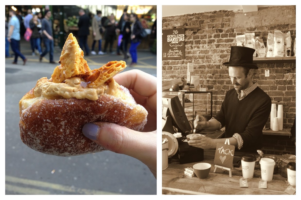 10:00 Borough breakfastBorough Market, the huge, historic gourmet food market near London Bridge, is always busy at the weekends, but mornings are less crowded. Don’t miss the epic Bread Ahead doughnuts (pictured). The market’s best coffee can be found at the Flat Cap cart or Monmouth. If you buy some of Monmouth’s locally roasted coffee beans, you can join the shorter queue on the right. For an impeccable cup of coffee in dapper surroundings, walk five minutes to the Gentlemen Baristas (pictured) on Union Street.