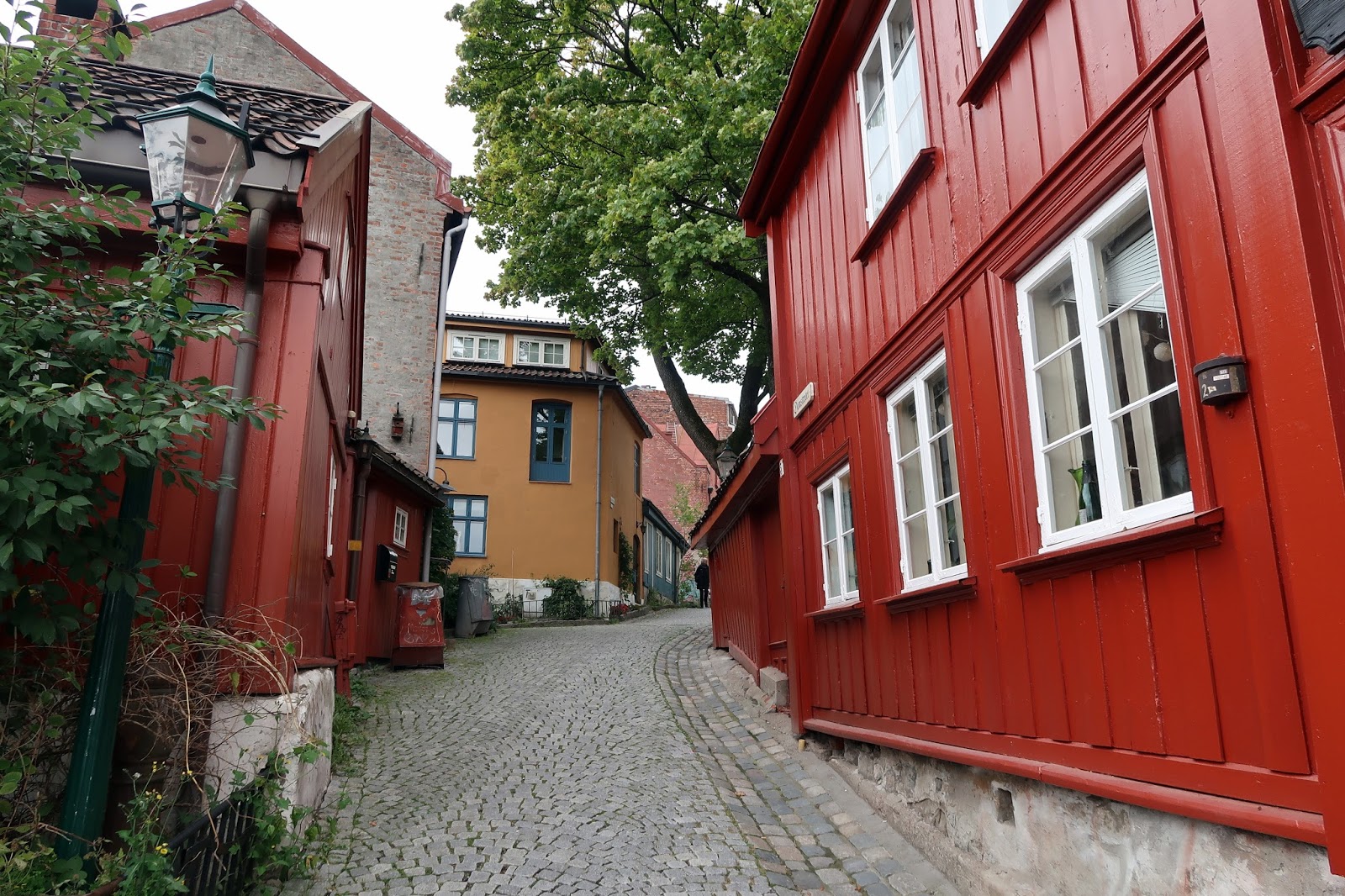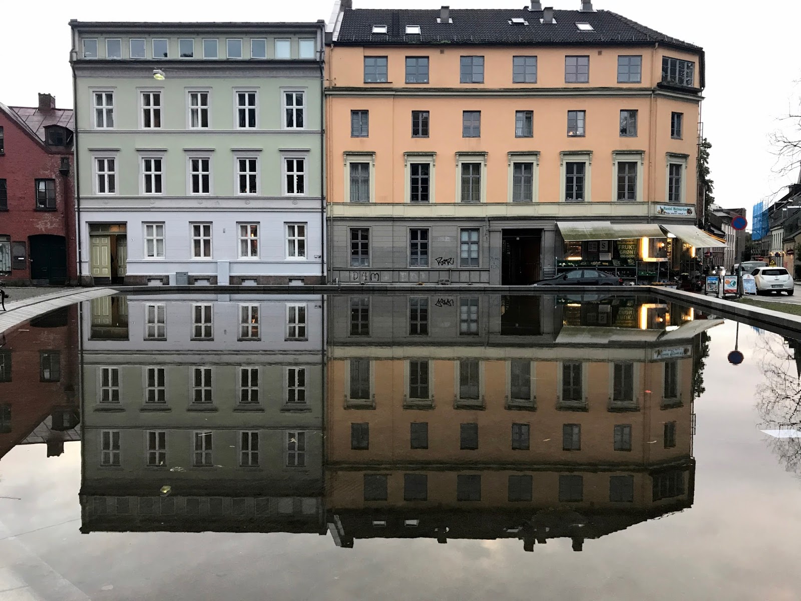 Two streets with particularly pretty colourful houses are Damstredet and Telhusbakken, both on the hill just west of Vulkan and the Elva river. The pond on the corner of Damstredet and Akersveien is a particularly good spot for reflected photos of the colourful houses.