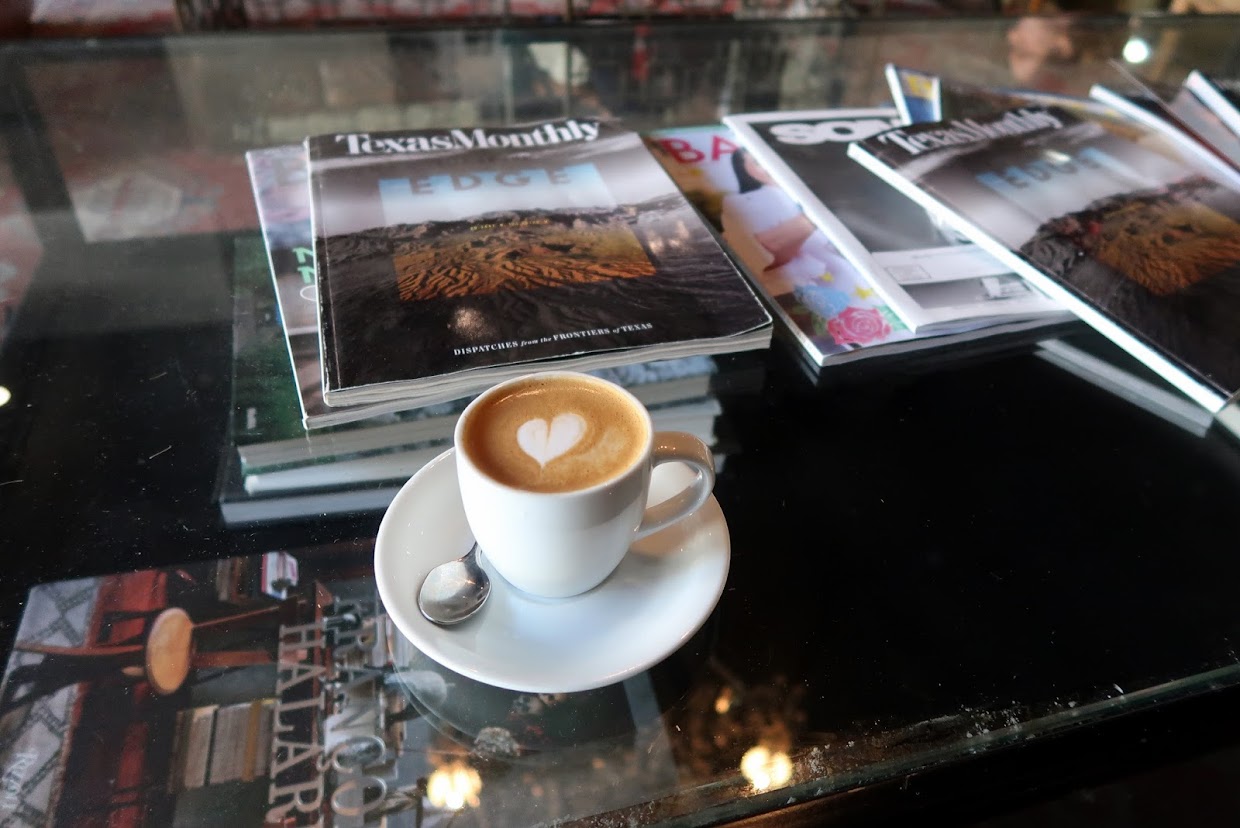 Austin’s self-proclaimed original specialty coffee shop opened up on West Lynn Street, to the west of the downtown area, in 2006. There are now five locations and I stopped by the most central, on Congress Avenue near West 8th Street. You order from the window on the sidewalk and if you’d like to drink your coffee in, you can take a seat on one of the sofas in the sleek lobby. They were selling retail bags of local Wild Gift beans (one of the roasters that managed to elude me), but the hopper held coffee from Spyhouse in Minnesota. I had a macchiato — cortados in the US, I have found, tend to be served much longer than I like — which came with my first latte art heart of Valentine’s Day. It tasted great too and the lobby was great for people-watching.