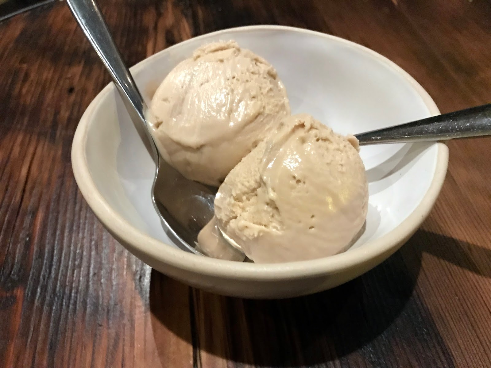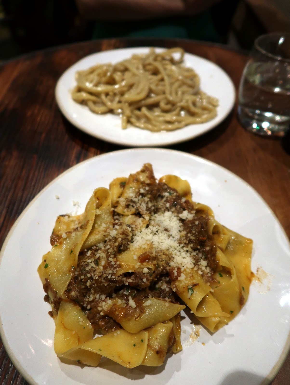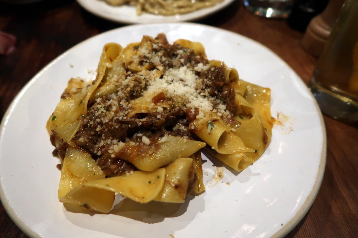 Then came the main event. We went for the bucatini cacio e pepe, which, like at Flour & Grape’s competitor, was the standout dish for me. Oodles of pepper, copious cheese and perfectly al dente pasta. A close second was the rich, flavoursome beef short-rib ragu, served with pappardelle. I thought the two pastas made a perfect pair. Our third choice (or mine, at least) would have been the roasted pork shoulder tortelloni — one for next time!