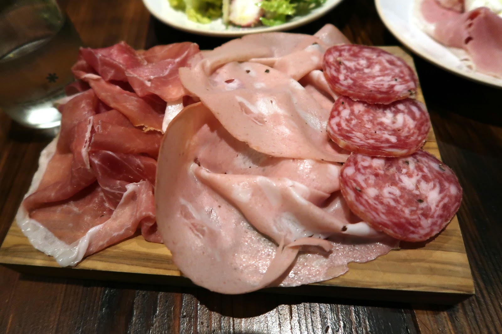 We then devoured the food menu, which consists of a variety of small plates (priced from £2 for olives to £7 for the salumi plate) and eight different pastas (£7–10). We decided we would share three starters and two pastas, and then order a third pasta if we were still hungry. Had we skipped the starters or been hungrier, we would definitely have gone for three pastas — and don’t get me wrong, our plates probably would have been cleared in any case.