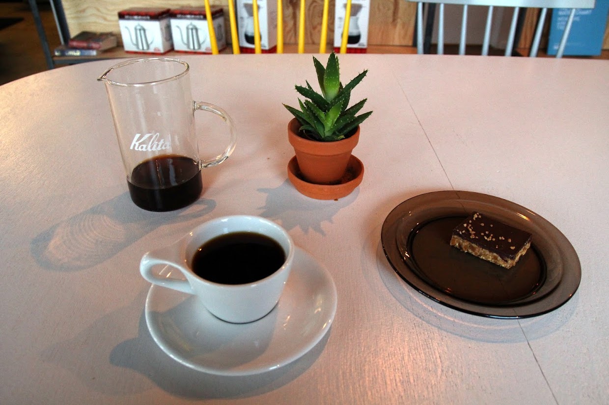 The very same Brazilian and also Guatemalan coffees were on offer, so I asked the barista for his suggestion for a filter coffee. We decided on the Brazilian coffee brewed with the Kalita Wave, which I matched with a chocolatey, nutty flapjack. This involved an eye-watering 1500 krona (₤ 10.60), although I later discovered that this is rather common for the city. The coffee, with its abundant, chocolatey notes was extremely well made, however, and also tasted scrumptious. I preferred the ambiance in the Brautarholt branch but they are both lovely cafés.