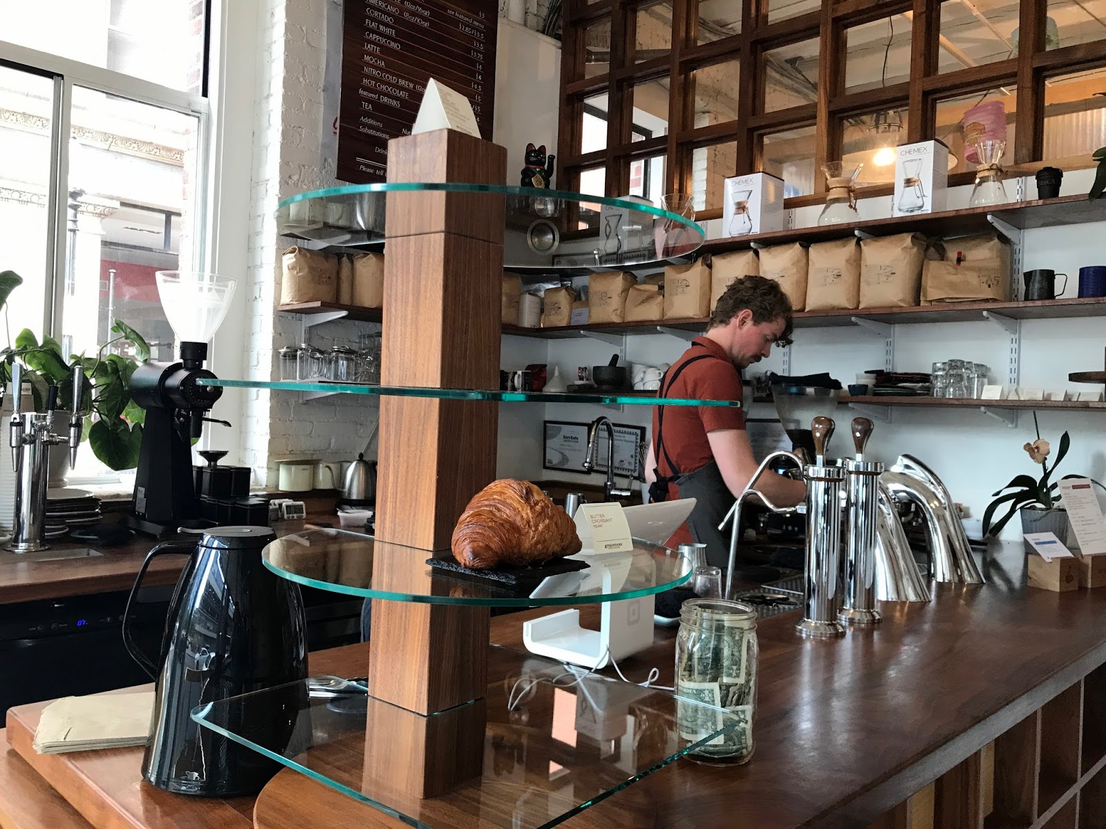 Strangely, I felt much cooler after my hot drink, even bathed in sunlight as I perched at the long, raised table attached to the big, west-facing windows along the side of the café. I was tempted to order an espresso tonic but I was also very tempted to buy the vibrant ultramarine mug or some beans, neither of which I had room for in my suitcase, and paralysed by indecision, I ended up buying nothing. I told myself I’d try to go back the following day but alas, the inclement weather put paid to that. Another time! I was less certain about the “Aussie cappuccino” on the menu (topped with Dick Taylor chocolate shavings), but then I rather enjoyed Cup & Bar’s Dirty Charlie in Portland.