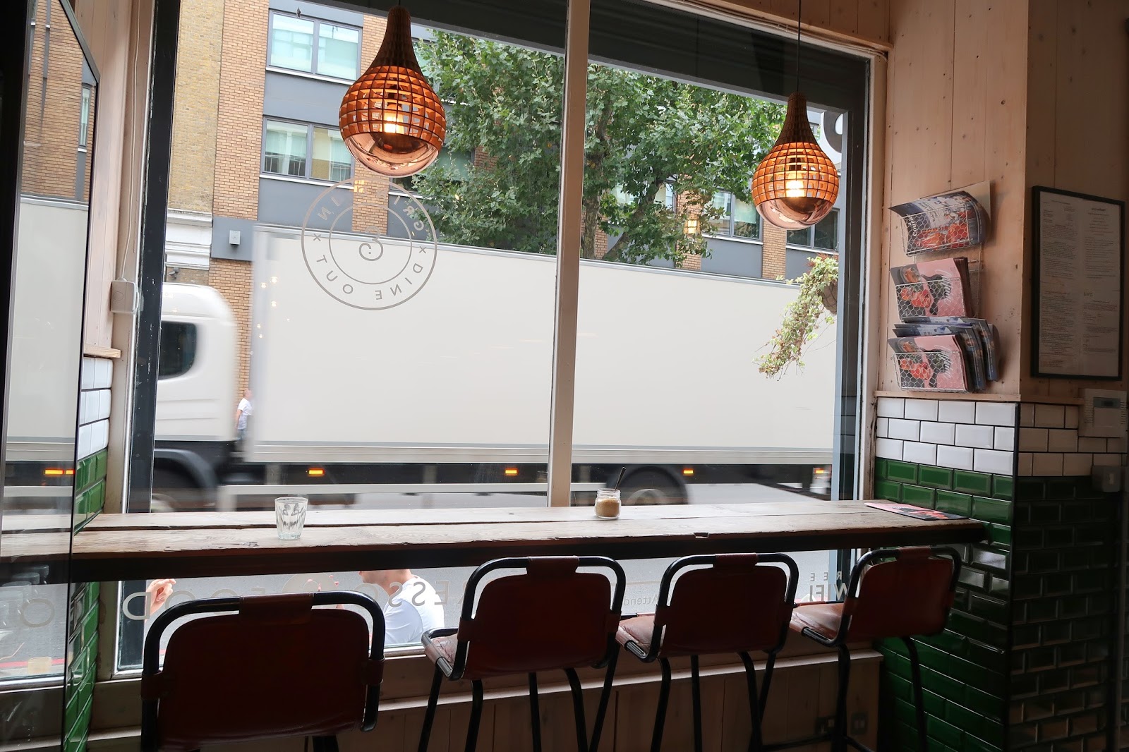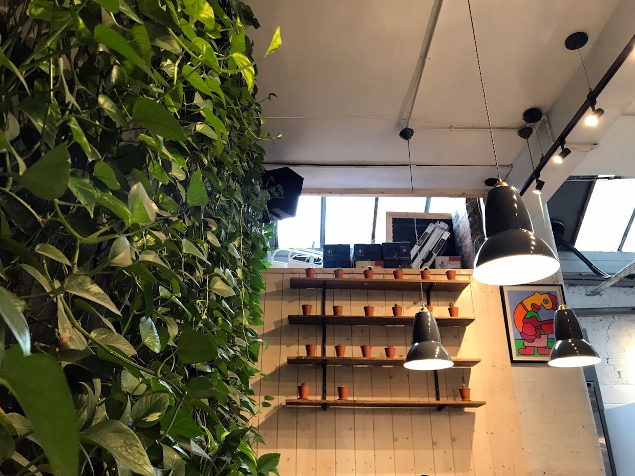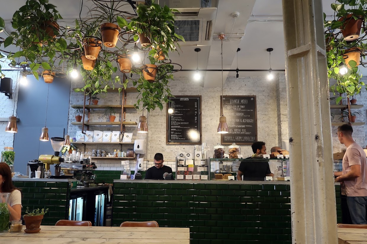 I stumbled across the Shoreditch branch while running some errands at the weekend and called in for a coffee and a sweet treat. The café’s interiors are much more verdant than the unassuming grey shopfront on Great Eastern Street might suggest. Dozens of leafy green pot plants hang from the ceiling and there is a living wall opposite the counter. The aforementioned tiling, which calls back to the Fitzrovia Attendant’s origins, is a vibrant deep green.