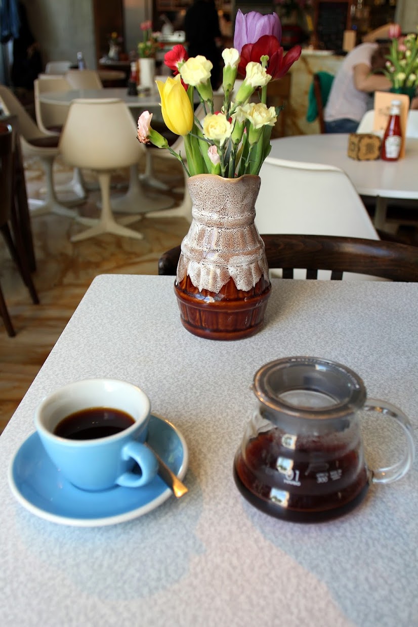 It was still busy — the outdoor tables were, unsurprisingly, popular with the brunch crowd so I took a seat indoors. The decor is quirky with old-fashioned wooden tables and marble floors contrasting with more modern tables and huge, colourful pendant lamps. Colourful posies of flowers adorned each table, which is always a nice touch. It was just a shame that I couldn’t keep all the ketchup bottles out of my photos!