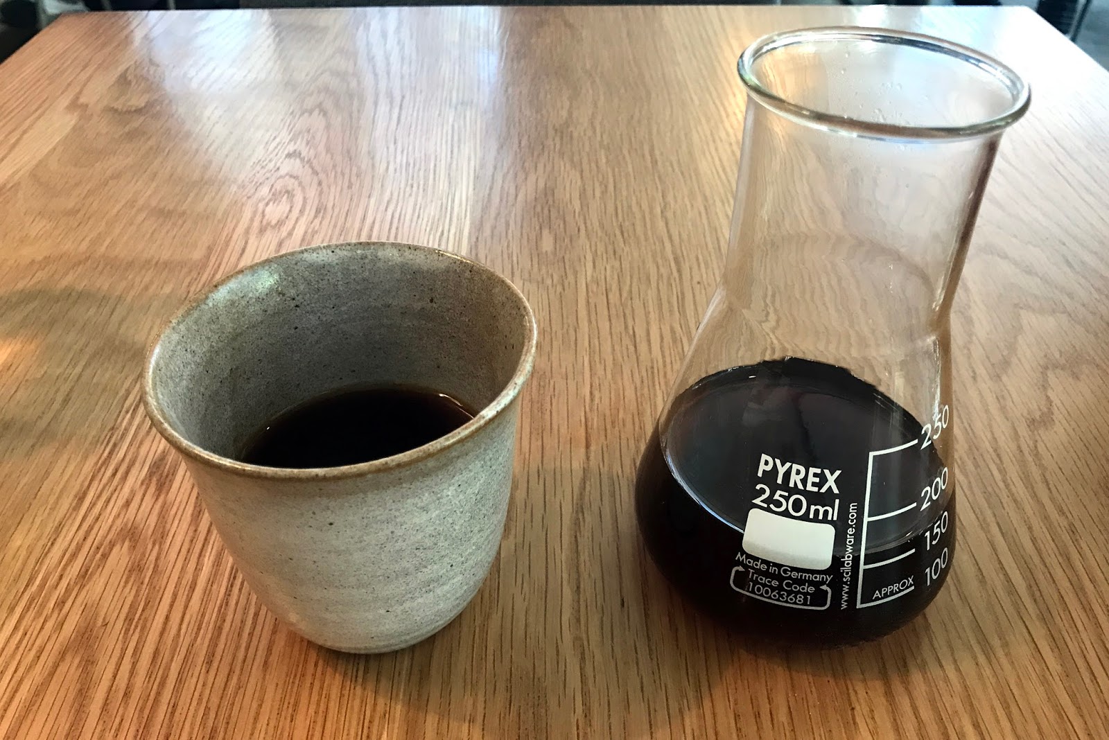 The coffee didn’t disappoint — Caravan coffee rarely does. The gorgeous floral and black-tea notes of the Deri Kochoha came through beautifully, particularly as the coffee cooled. The presentation was as spot-on as always too with a rather lovely ceramic cup and the usual scientific flask serving as a carafe.