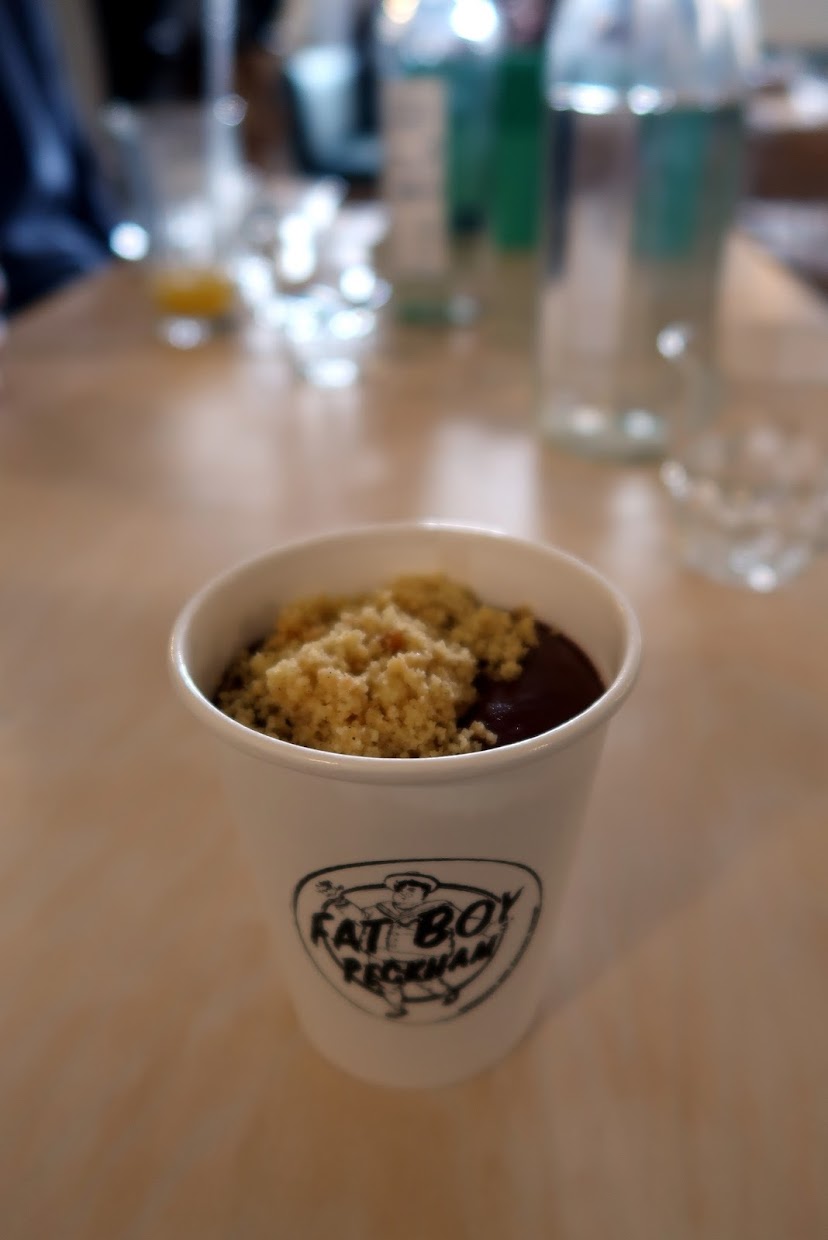 We did almost regret not ordering the full English for two (£30), which came served on a huge platter of deliciousness, but our ‘modest’ main course meant that we had room for a pudding. The pudding was a millionaire’s shortbread (£6), with rich chocolate sauce, brown butter caramel, crumbled shortbread and ‘waste barista milk ice cream’ (yes, we are in Peckham). It came served in a cup with the logo of the premises’ former occupants, Fat Boy, and once all the layers were mixed, it tasted heavenly.