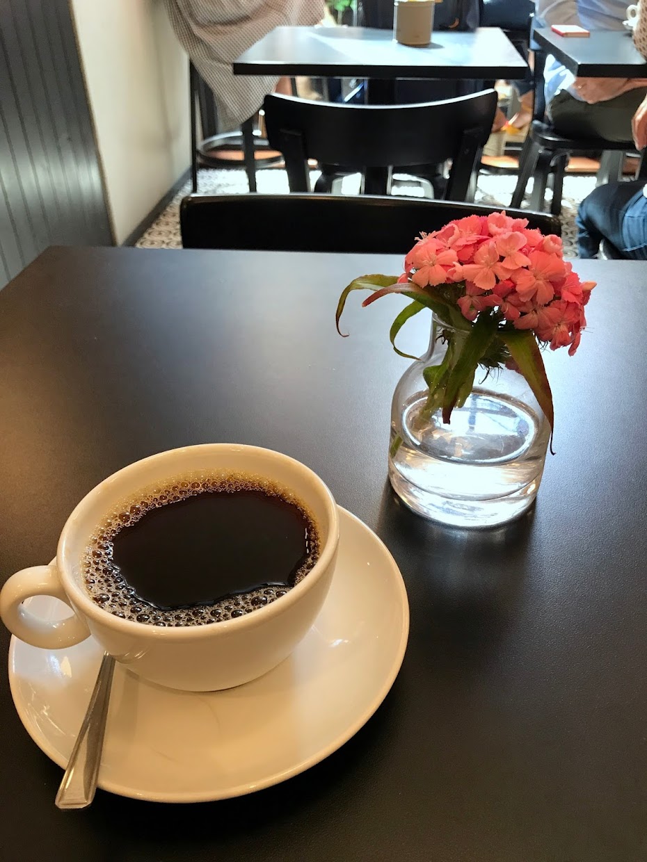 I had a full stock of coffee beans at home, so I proceeded down to the basement cafe, which offers a sleek and classy respite from the busy West End with its monochrome decor, accented with colourful posies of flowers on each table. There are a dozen or so small tables downstairs and it was completely full during my visit, which was nice to see. I nabbed the last remaining table and then went to the brew bar to order.