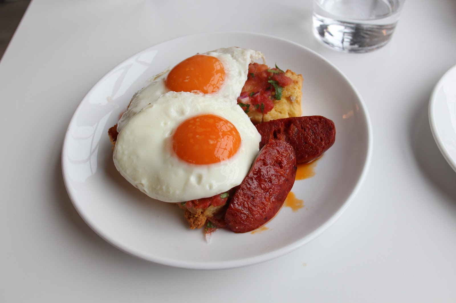 The brunch menu includes a few smaller items — pastries, banana bread and granola — and, on the day I visited, three tempting brunch specials, one sweet (french toast with bacon, maple syrup and blueberries) and two savoury. There were also two baked egg dishes available to share, which I hope to sample when I return with my brunch club later this month. In the end, I ordered the cornbread with fried eggs and tomato salsa (£8), adding chorizo for an extra £2. The food was really tasty: the eggs were perfectly runny and the salsa was piquant enough to add some spice to the dish. The chorizo was great too, although the portion felt a little stingy.