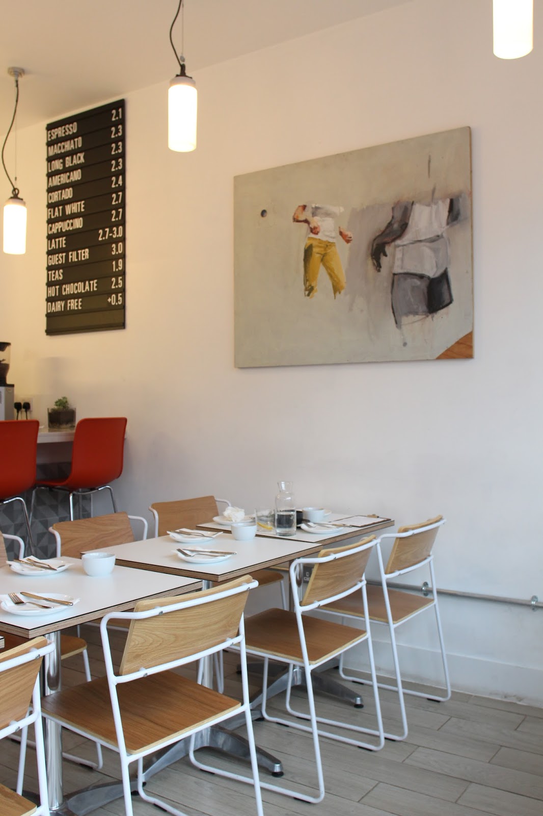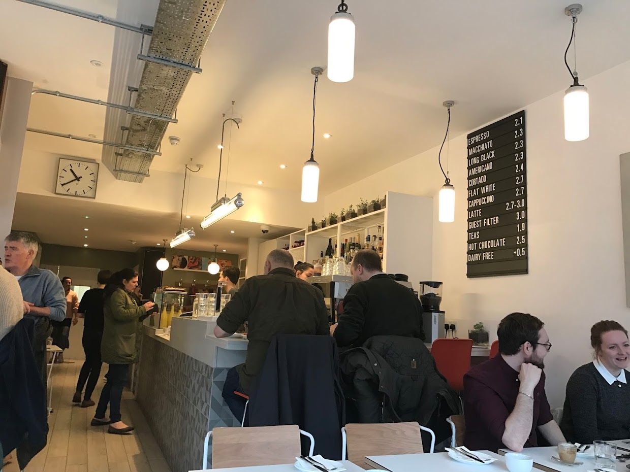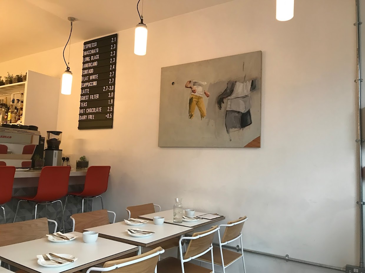 I arrived just after 10 am on a rainy Saturday morning and, as I had heard reports of long-ish wait times, I was pleased to find that there were still several tables available; by the time I left, the place had filled up — and happily, they do take bookings. From the outside, it’s a little hard to believe you are still in Walworth and not somewhere like Nolita in New York. The café is beautiful with a contemporary, minimalist design and a space that is bright and airy, even on a grey day, thanks to the large front windows and white and light-wood décor. There are several smaller tables at the front and some larger spaces along the side, as well stools at the central bar.