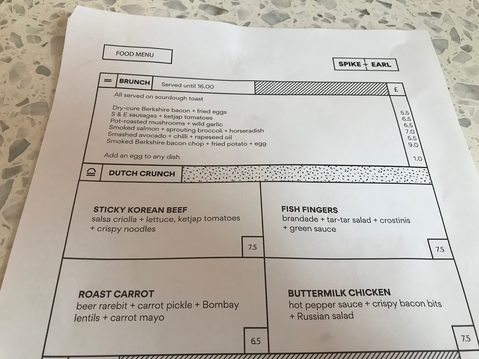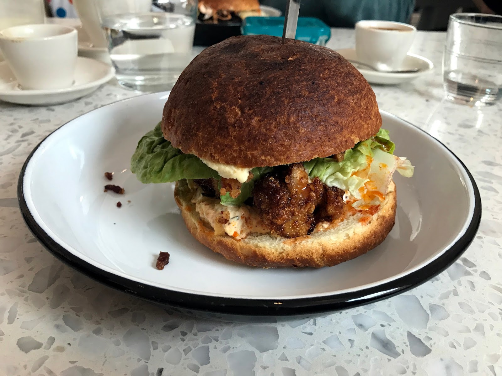 The brunch dishes sounded nice and looked great but we were more interested in the Dutch Crunch sandwiches. We didn’t know what these were — my friend wondered if Dutch Crunch was Cockney Rhyming Slang for ‘lunch’ (it isn’t, but totally should be) — but a quick bit of Googling indicated that it was a kind of bread with a mottled crust popular in the San Francisco area. There were four fillings available, including one fish and one veggie, all of which sounded bloody brilliant. We did have to wait until noon, when the Dutch Crunch shift starts, but it was well worth the wait. Between us, we tried two of the buttermilk chicken (with crispy bacon and hot sauce) and one of the sticky Korean beef. The former was the winner — perfect crispy-juicy fried chicken that contrasted nicely with the toothsome roll — but the beef also went down very nicely. Both sandwiches were a very reasonable £7.50. Despite the wait, we were very happy customers.