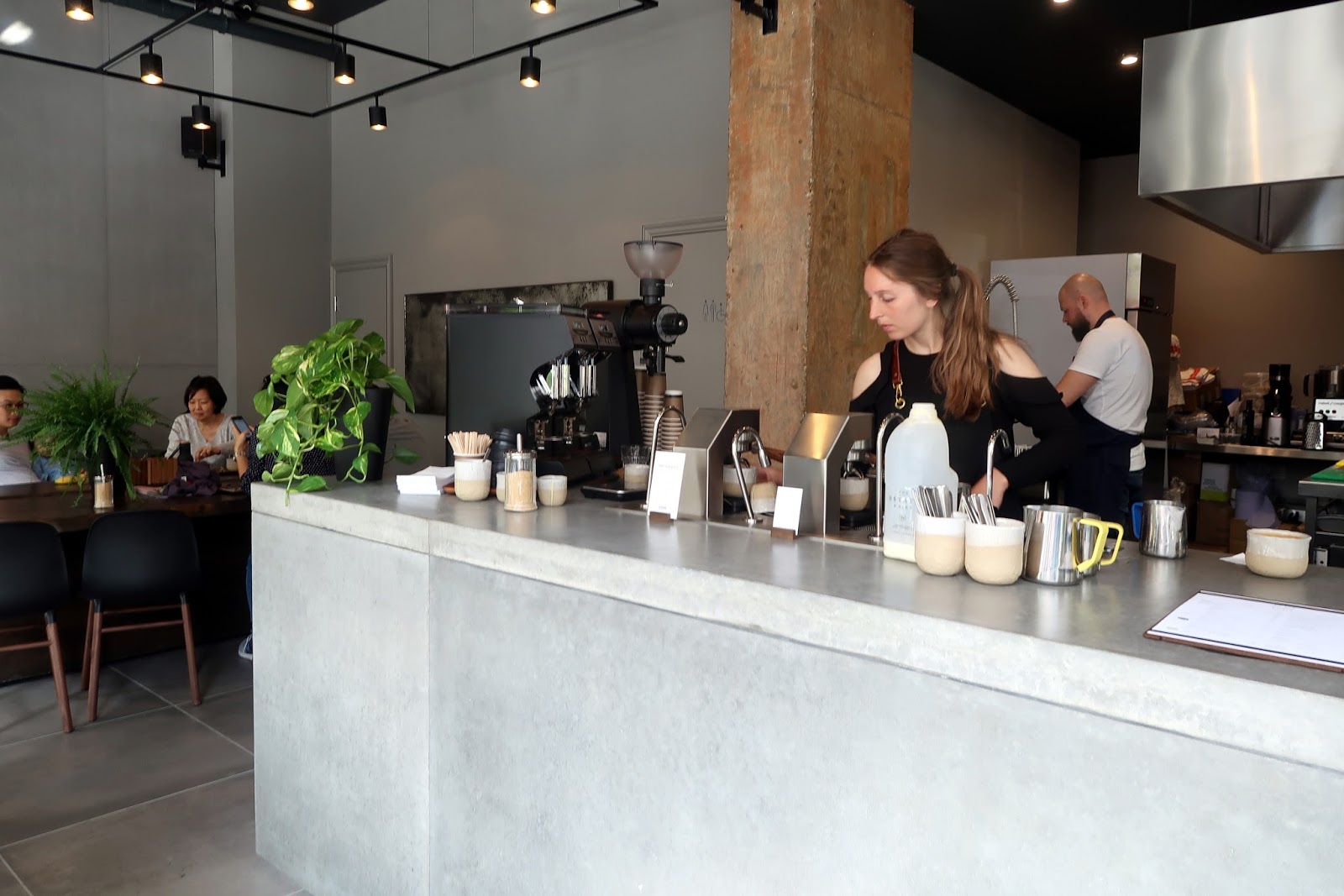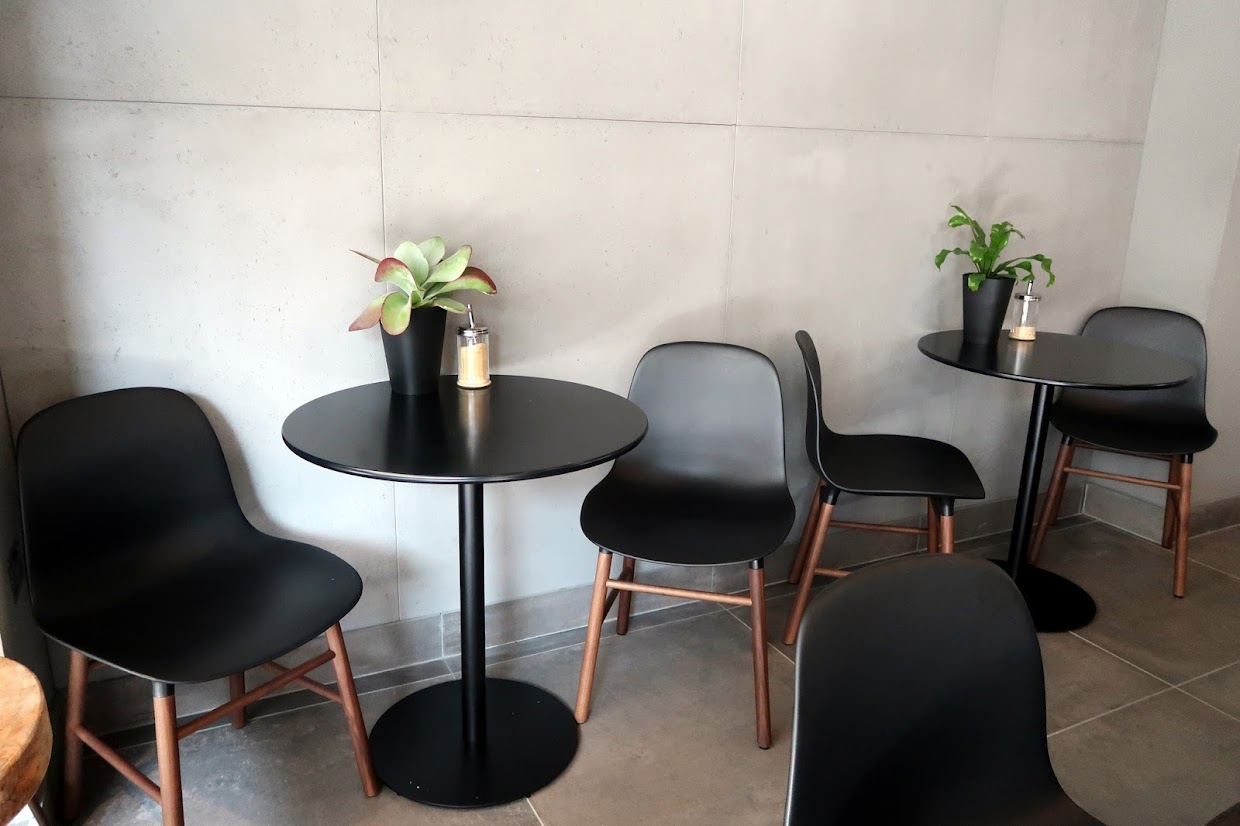I arrived just after 10:00 am and all of the sun-drenched pavement tables were already taken, although there was still plenty of seating inside. I took a seat at one of the beautiful wooden stools perched in front of the window, which afford excellent people-watching. There are several other tables inside, both a larger, wooden communal table and smaller offerings. As will soon become a theme in this review, everything is thoughtfully designed and chic, but practical too.