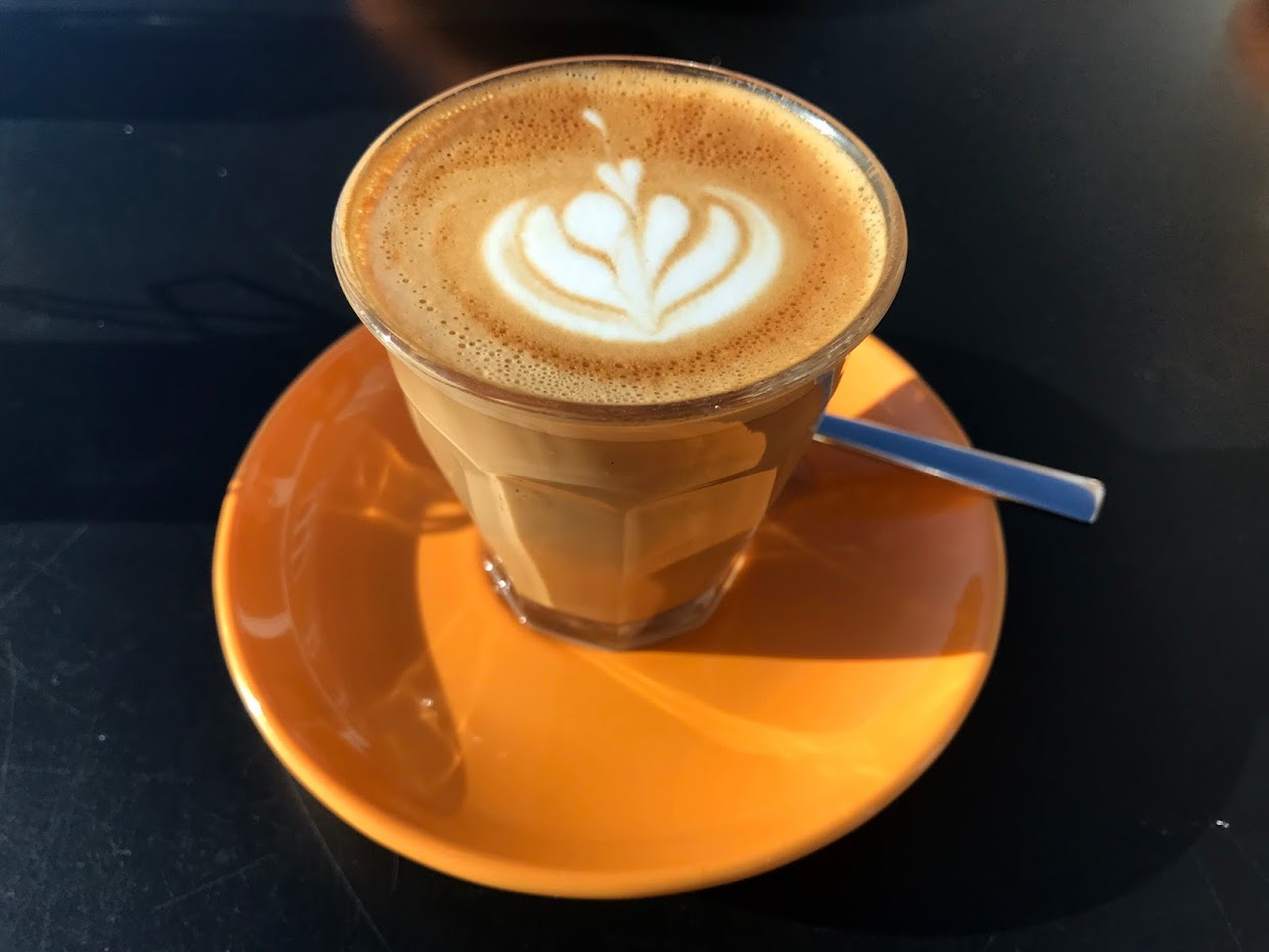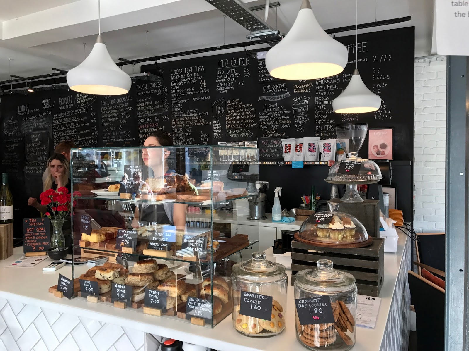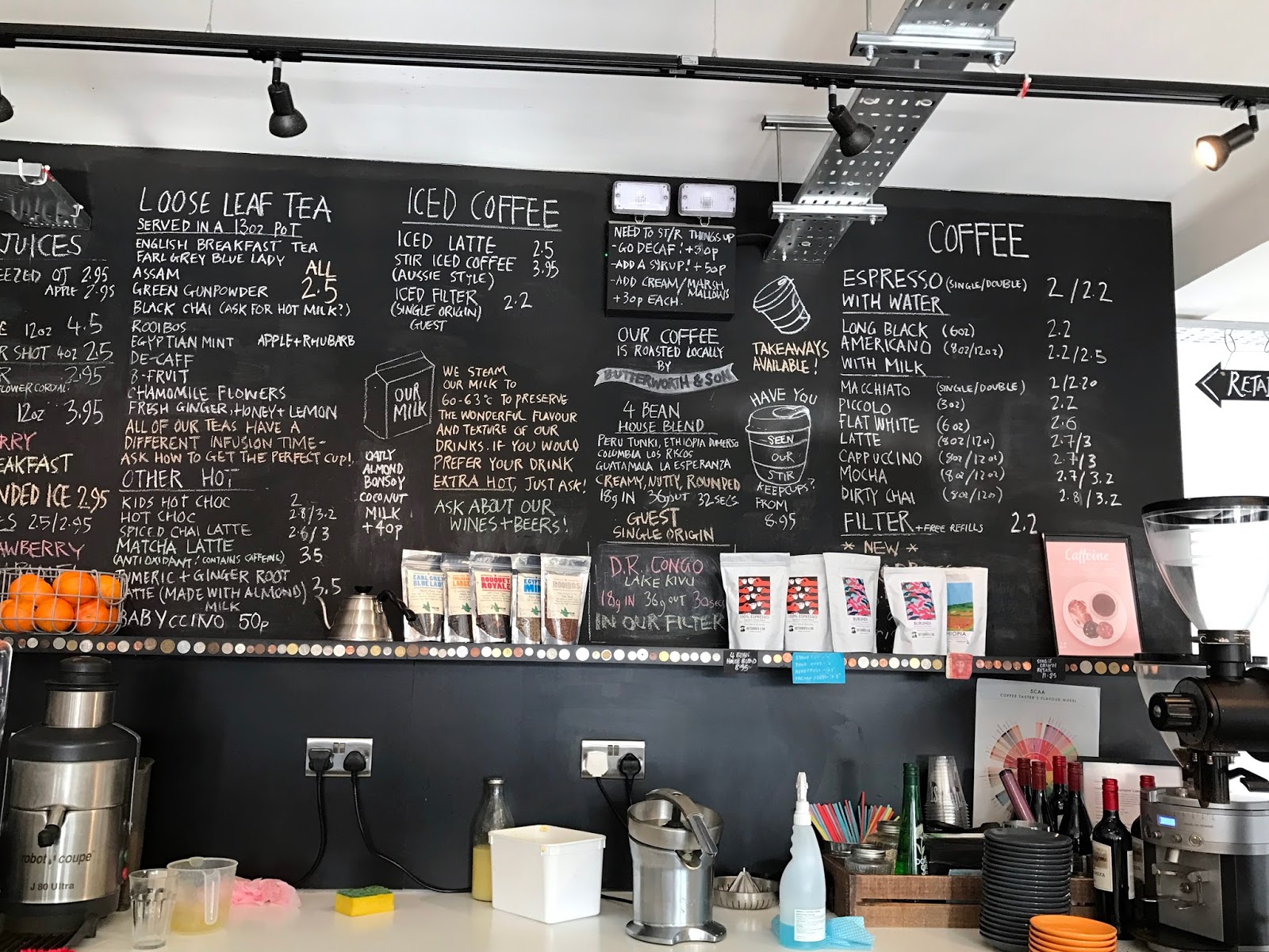 The coffee is from Bury St Edmonds-based roaster Butterworth & Son, and there was a 4 Bean house blend on offer, as well as a single origin from Lake Kivu in DR Congo. The menu is almost like an infographic with milk steaming temperatures and espresso recipes (the 4 Bean stats are 18g in, 36g out for 32 seconds, in case you’re interested). There are various teas, wines and beers, a big brunch menu, and plenty of cakes and other sweet treats, but we were still full from our pub lunch.