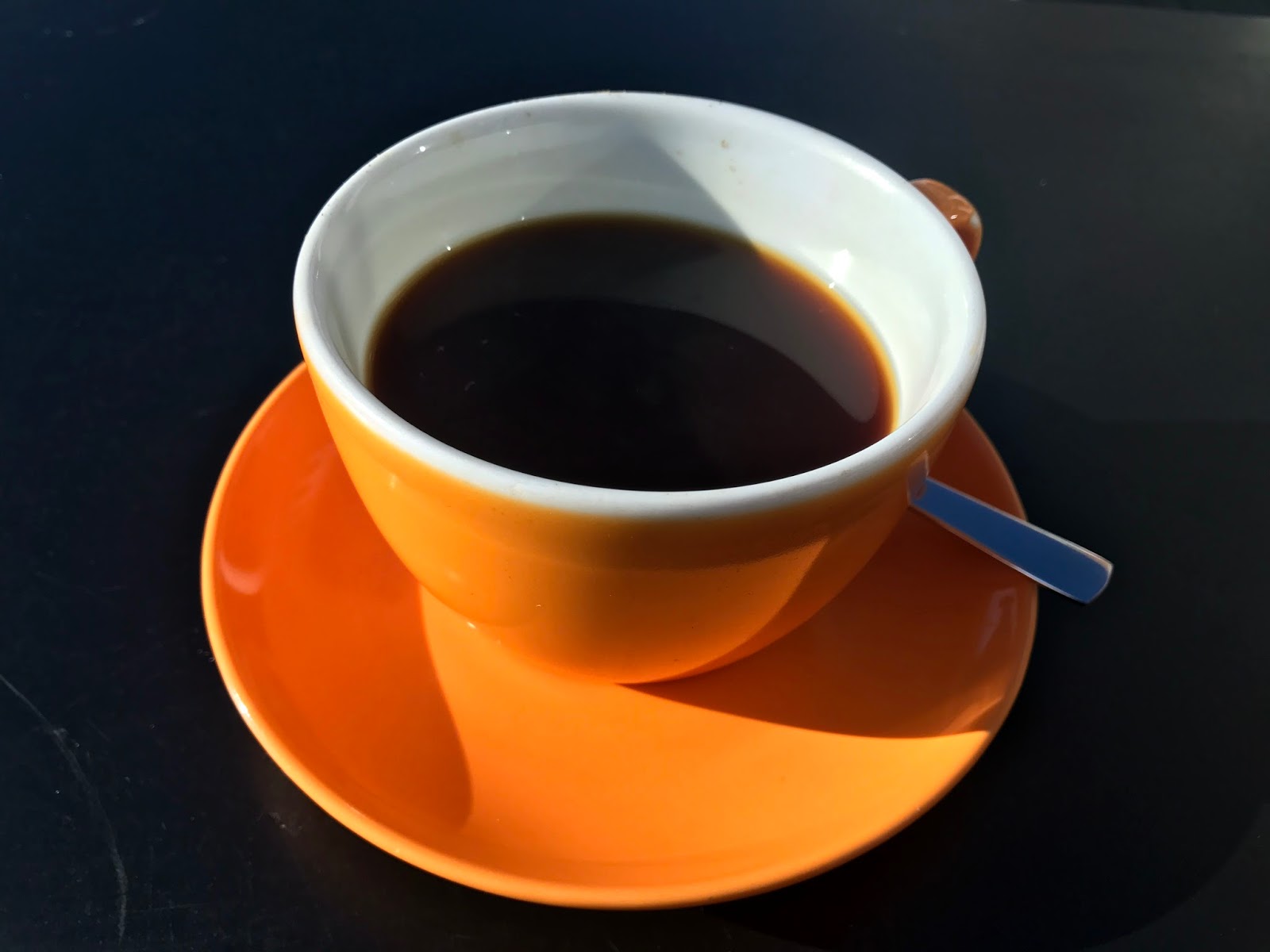 Last weekend, I went to stay with a friend from university who now lives fairly close to Stir, so after an excellent pub lunch at the newly refurbished Petersfield pub and a wander through my old college and our old faculty, we made a beeline for the cafe. At around 5 pm, the cafe and its outdoor seating were bathed in sunshine and there was certainly no need for any of the cosy orange and grey blankets piled thoughtfully near the door. There is a bit of an orange theme going on, with the crockery and the opening hours on the doorway also taking on a citrus hue.
