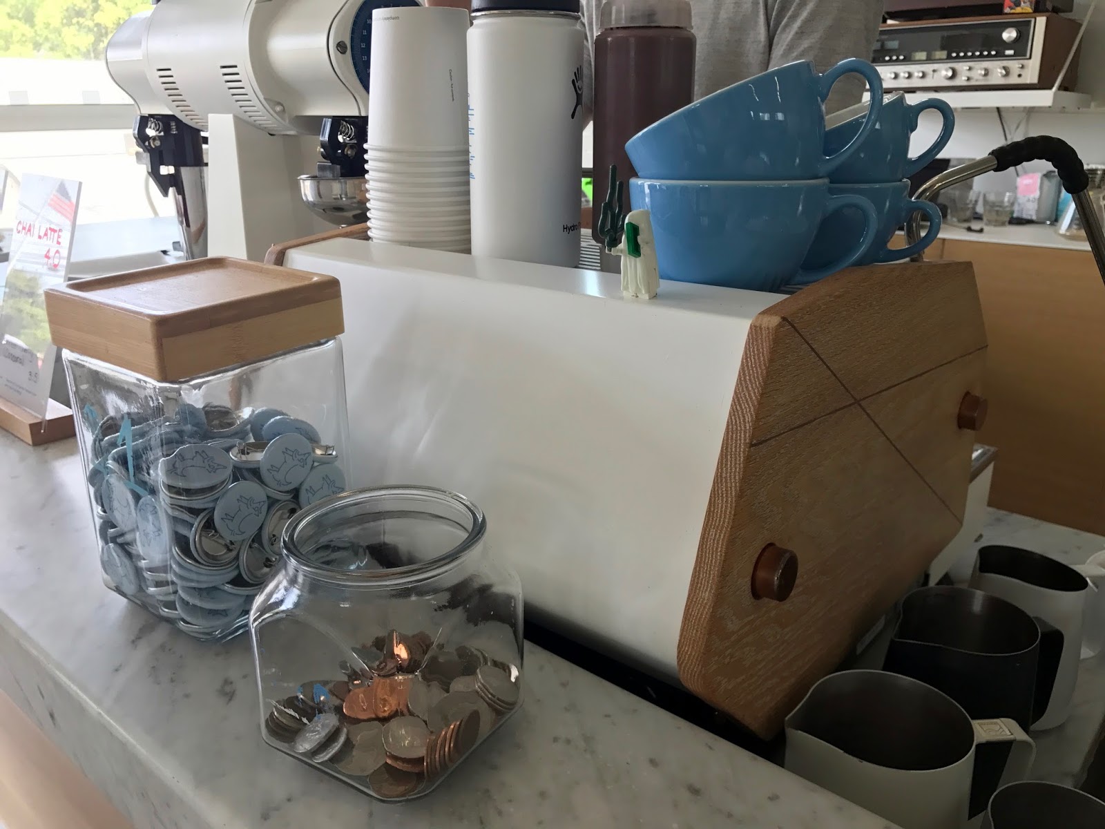 As for the coffee, the menu keeps things straightforward (espresso, cappuccino, coffee, etc), bearing in mind that in a small town, not all customers are going to be well versed in or interested in the more complicated (or complicated-sounding) speciality coffee offerings. There was as a Colombian Leandro Osorio available as espresso, and an Ethiopian Dhiilgee as a batch brew. Chris said he’d be happy to brew me up any of the other varieties as a pourover but the Dhiilgee sounded really nice, the batch brew was fresh and I was a little pushed for time, so I ordered that and a cortado. The espresso machine — “just a La Marzocco” — has had some mighty fine customisations and looks very cool on the counter.