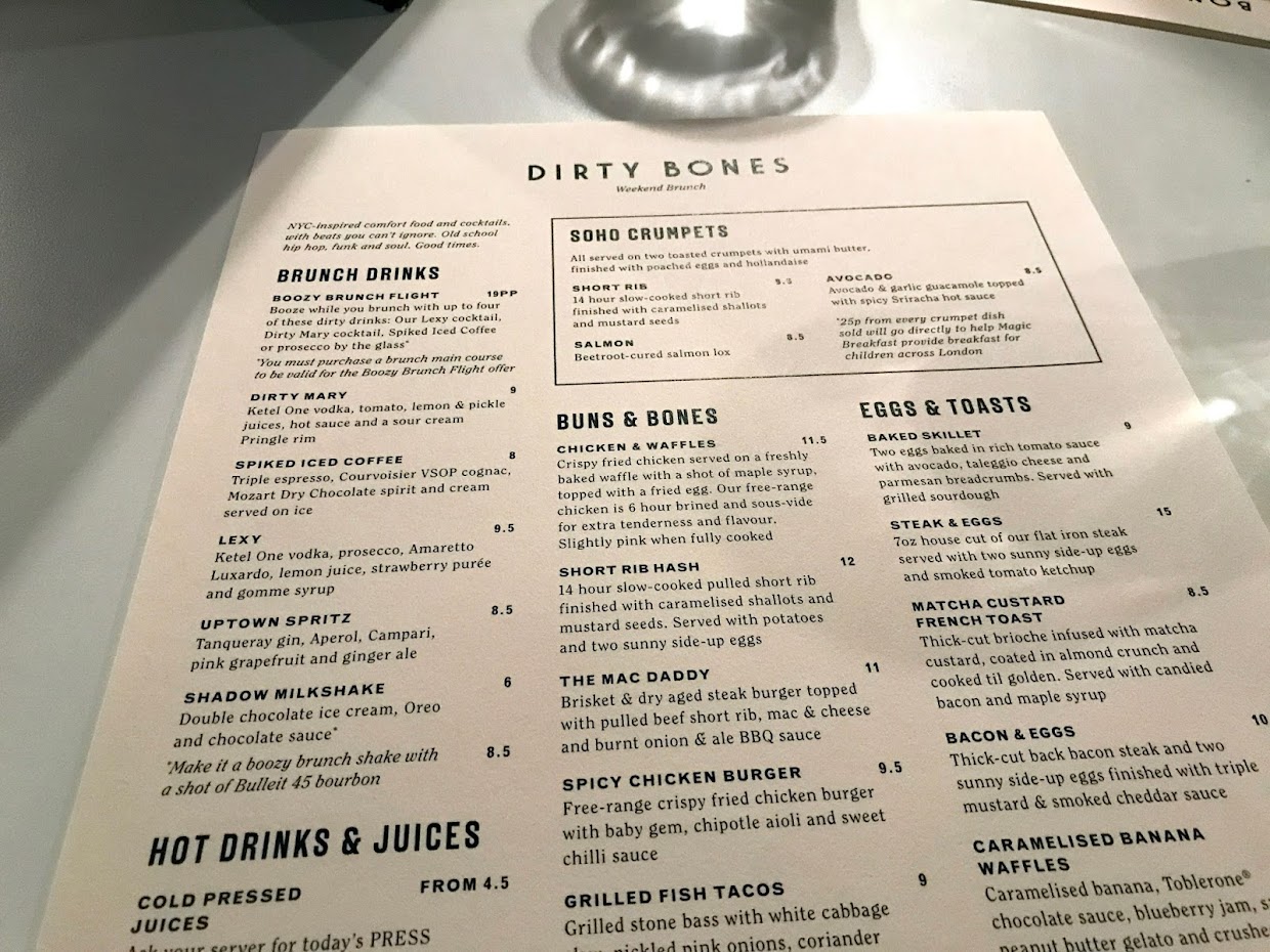 The latest venue for my monthly girls’ brunch club was the newest location of meat-centric modern American restaurant Dirty Bones. As soon as I saw the extensive and varied brunch menu, with everything from avocado on crumpets (yes!) to chicken and waffles, I knew it was our kind of place. We were only able to get a reservation for our group for 10:30 am in the new Denman Street restaurant (NB: don’t confuse this branch with their ‘Carnaby’ location, which is also technically in Soho), but I quite enjoyed walking from the Tube through the near-deserted streets of Soho.